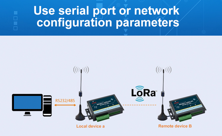 Device A is connected to the computer through serial port cable. Using the graphical configuration software provided by our company, the parameters of local device a can be configured conveniently and quickly, and the parameters of remote device B can also be configured by the wireless network.